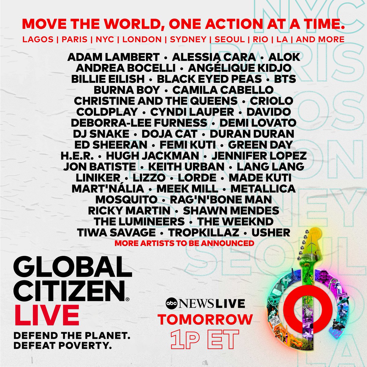 BTS Jennifer Lopez Lizzo and Elton John are among those who will headline the Global Citizen Live highlights show on ABC this weekend. Hailing from 6 continents the broadcast will feature artists celebrities and world leaders coming together to create change and impact climate and.